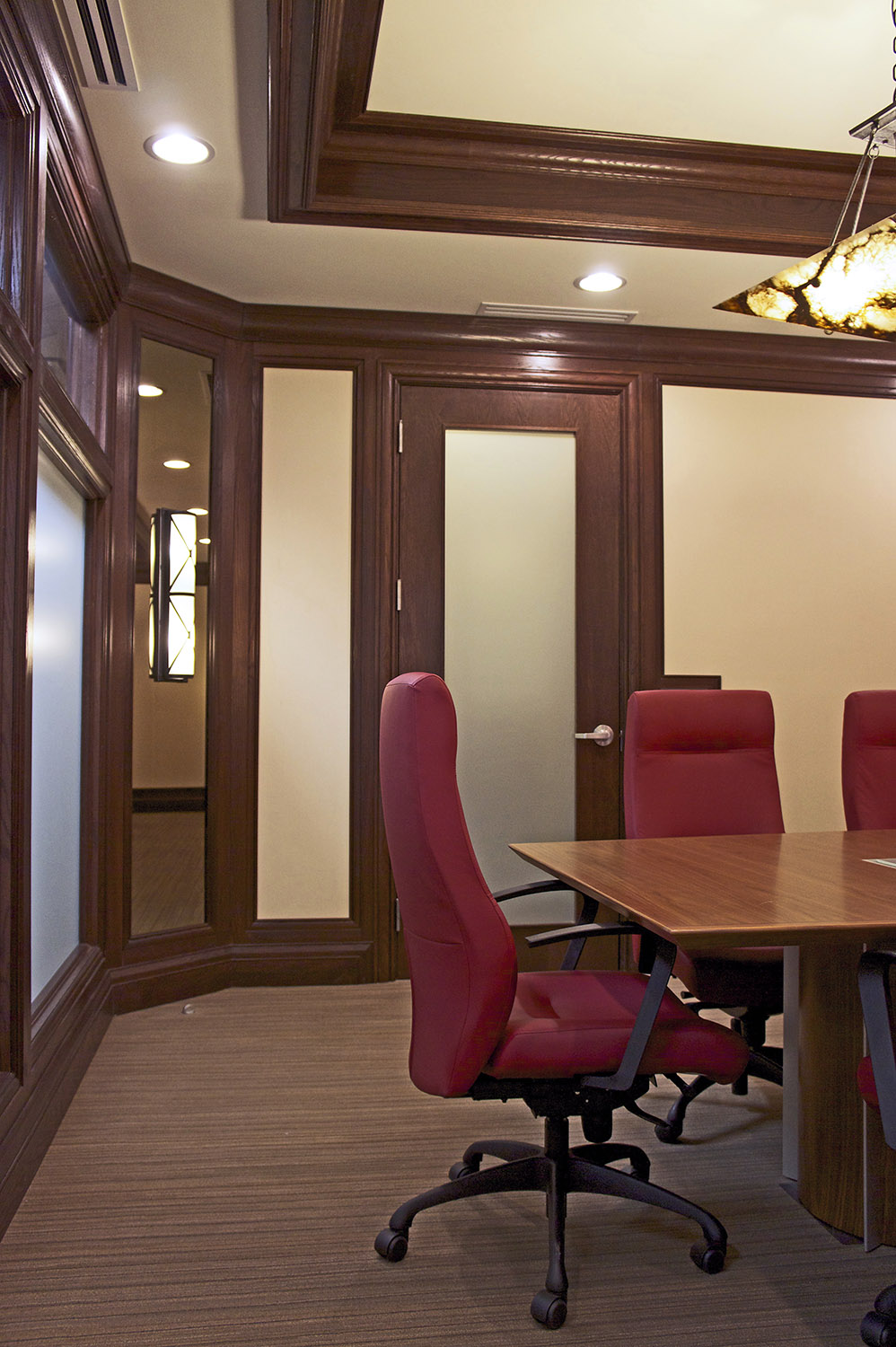 This carefully desgined room is both attractive and useful. It was critical to merge cutting-edge technology with elegant furniture and materials while redesigning this Conference Room. Wood moldings lend a traditional feeling, but contemporary light fixtures update the style for the twenty-first century. Vibrant red and blue accentuates the artwork, while small details like accent tiles and hardware selection complete the office’s tailored style. This TI project is one for the books!